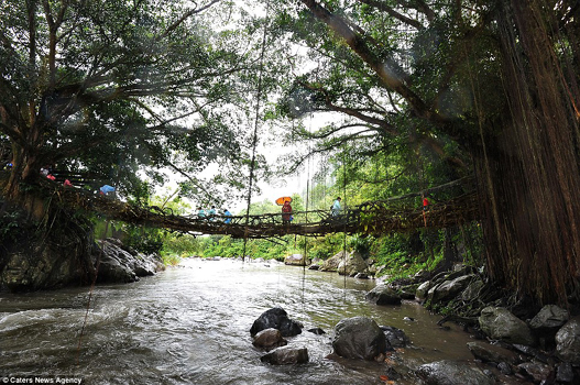 ‘They are extremely vital to the villagers and their entire lives depend on them. ‘The creations are remarkable but you have to be careful when walking on them in the rain as they become slippery – and that’s not good when hovering five metres over a fast-flowing river.’