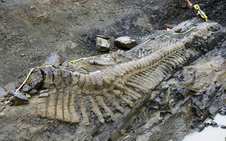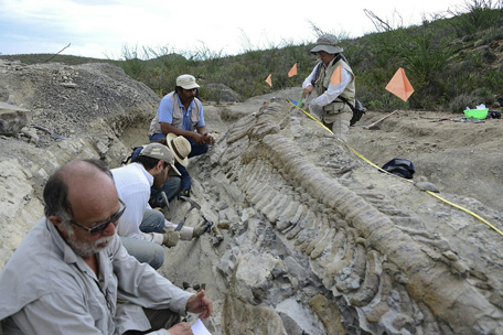 Paleontologist Felisa Aguilar says they uncovered roughly half of the dinosaur, which was 36 feet (12 meters) long and lived about 72 million years ago.