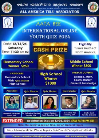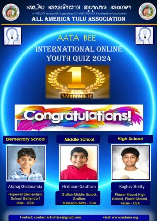 USA: The second season event of AATA BEE International youth Quiz for year 2024 was held during the last two weeks of December. Tuluva kids from more than 80 schools from the United States and Canada participated in this online event with great enthusiasm. The quiz contest was held at three levels, High School, Middle School and Elementary School. It was a real test for critical thinking on Science, Mathematics, History, Sports, General Knowledge and more.
