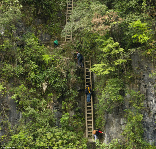 These schoolchildren in southern China are so keen to get to school that they make the perilous journey on narrow wooden ladders every day, with no safety precautions. Their village in the remote Badagong mountains in Sangzhi county is surrounded by sheer drops on every side, making the school run a daily struggle. The only way out of Zhang Jiawan village, unless the children have time for a four-hour cross country detour, is via a series of rickety-looking ladders leading down to the valley below. Children climb the ladders to get to school in Hunan province, China