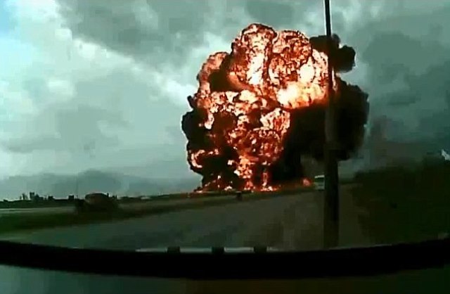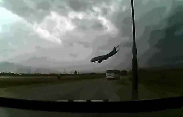 But suddenly, the plane, described as a Boeing 747 cargo flight, appears to stall, twisting and dropping rapidly before crashing to the ground in a fireball.