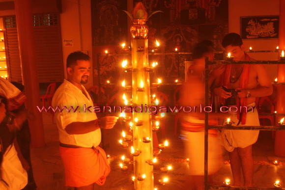 A special “Deepalankara” was organised on the eve of Balakara Sarvajanika Sri Sharada Mahotsava in Vithoba Temple Road at Sri Krishna Mandir, Mangalore. The entire hall was glimmered by the light of earthen lamps. and Goddess Sharada enthralled all.