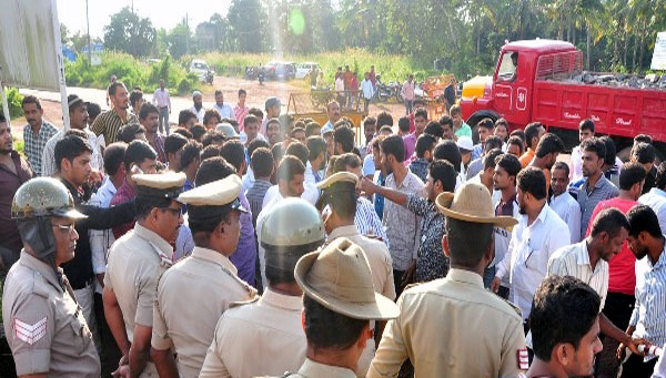 Mangalore, October 28: A protest was organised on Monday October 27th by the popular front of India (PFI) in front of Konaje police station demanding the arrest of Bajrang Dal activists for the alleged abduction and forced marriage of Vivita Sonia D’Souza to Roshan Shetty on October 16th.