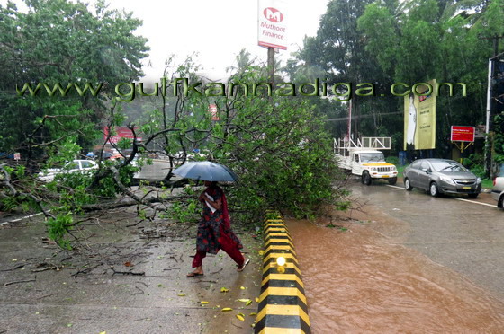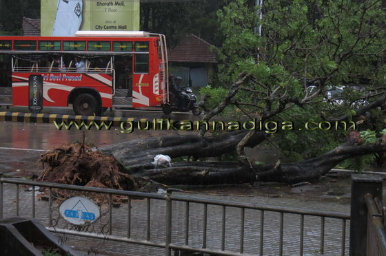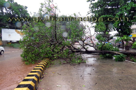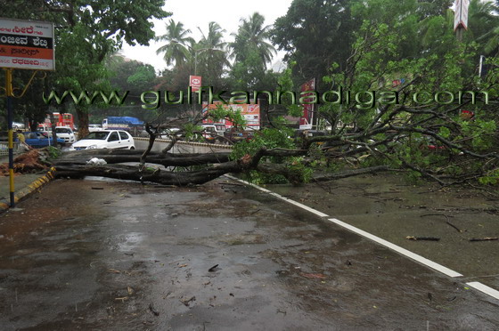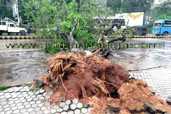 Mangalore, June 7: It has been reported in the city that one of the trees on the Lalbaug road side, opposite Pabbas, fell on the Mangalore-Udipi highway road along with root due to torrential rain on June 7,Friday.