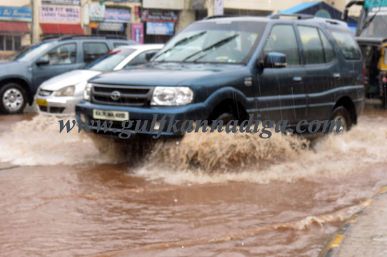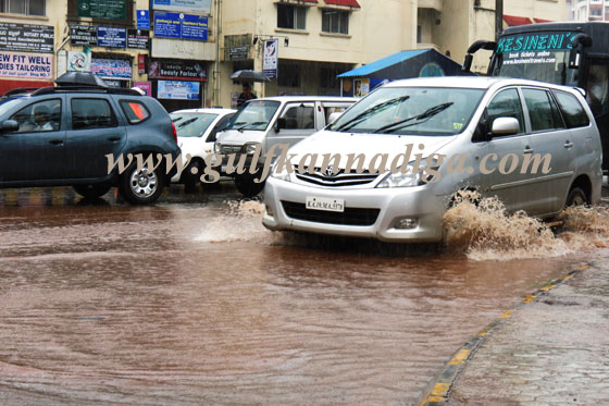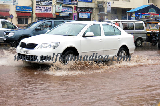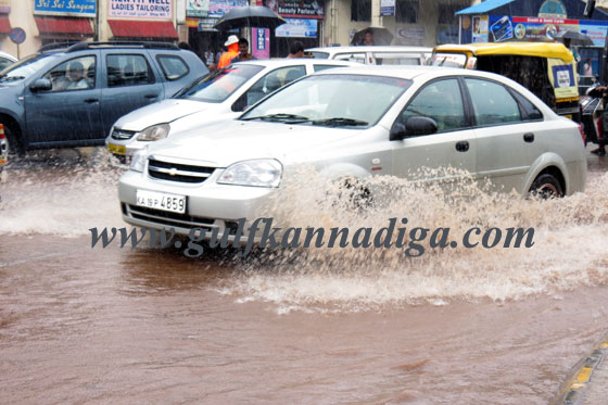 Mangalore, June 10: Due to continuous rains which lashed out in the coastal region for the past five days, all the roads have been filled with rain water, which created heavy traffic jam everywhere in the city. It seems some parts of the city were looking like river due to rain water. In city, rain which started at 8.00 pm in the night has continued till Monday morning.