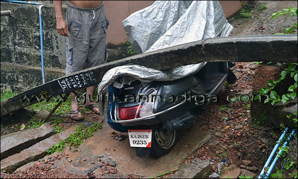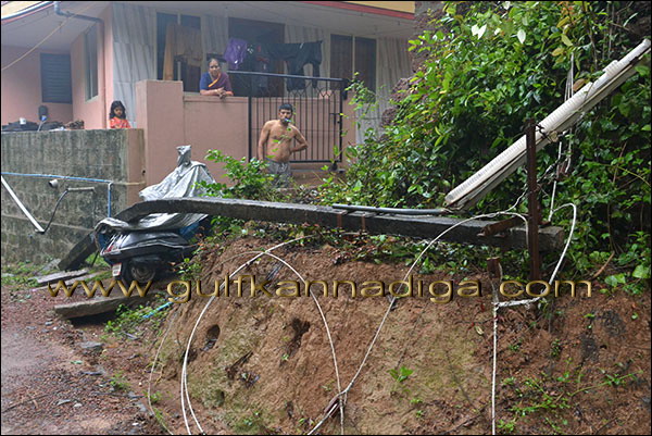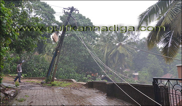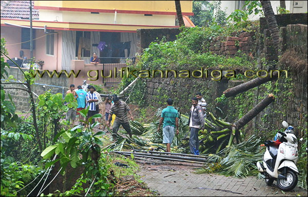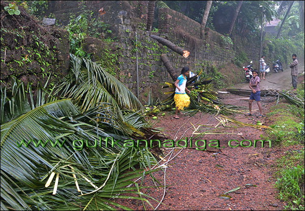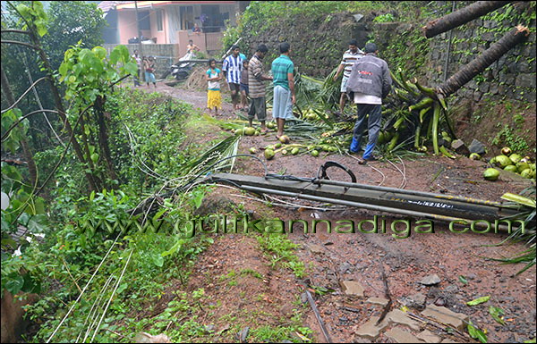 Mangalore,June.13: A coconut tree was uprooted and fell on the electric wires, in Maroli Kembar, opposite to the KEB Office at around 2 am on Thursday, June 13, 2013. The tree was from a compound owned by Felix.