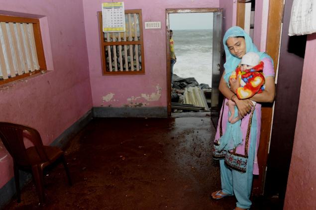On Thursday evening, some pebbles, sand, pieces of laterite soil bricks lay strewn across the hall suggesting that a big wave had moments ago knocked the rear door, which she generally locks. The water enters through the front door as well though she placed sandbags for protection — a measure employed even by her neighbours.
