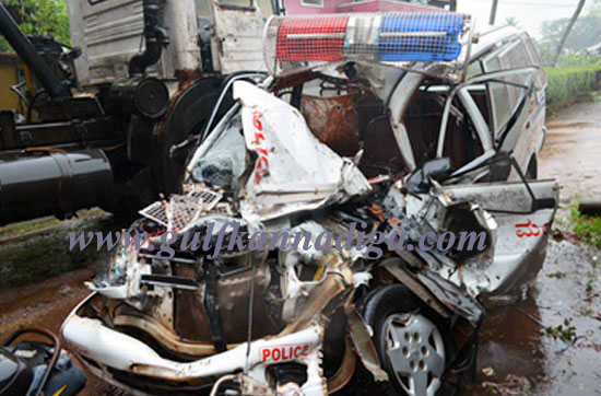 Sources said that the PCR van, belonging to Mulky police station was coming from Bajpe airport from the wrong side of the four –lanes highway, resulted in an accident. Due to the impact of the accident PCR van has completely mangled.