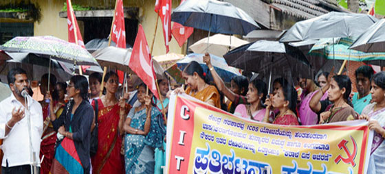 Mangalore, July 11: District committee of CITU and state Anganwadi workers association jointly organized a protest in the Dakshina Kannada zilla panchayat on July 10, Wednesday, opposing the privatization of the ICDS project and to fulfill the longstanding demands.