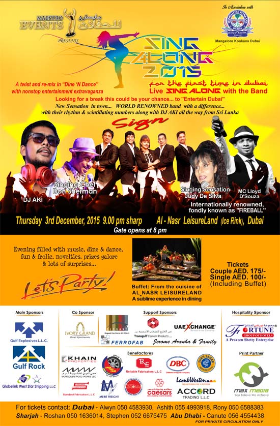 At 8:00pm on 3rd December, 2015, the Ice Rink gates of Al-Nasr Leisureland, Dubai will open to a massive crowd of fun loving people of Dubai to give them an experience of spectacular evening filled with music, dance and masti. The much awaited event of the year “SingAlong 2015” a twist & re-mix of Dine ‘N Dance, organized by Mangalore Konkans Dubai is scheduled to begin at 9:00 pm sharp.