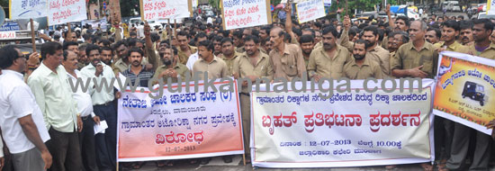 Mangalore, July 12: Members of various auto rickshaw drivers’ union in the city organized a big rally in front of city’s Jyothi cinema and marched in protest towards DC office, raising slogans against officials on July 12, Friday demanding an immediate ban on entry of rural auto rickshaw drivers into the city limit. Later they protested in front of the DC office.