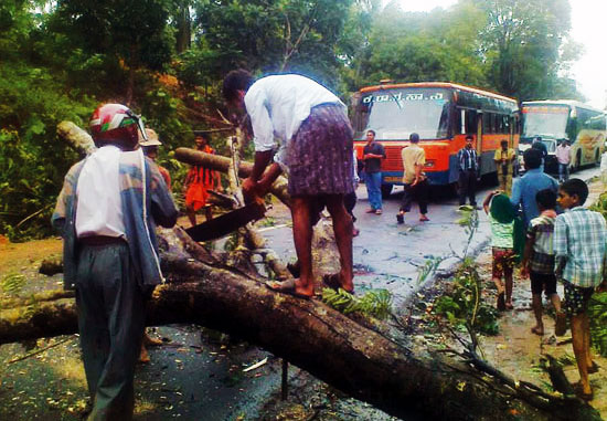The incident took place in Mangalore to Bangalore N H route, in front of Maani Daarul Irshadiyya Education Centre, where with support of the public, felled trees were shifted to other place by cutting to pieces. Hence Mangalore – Bangalore and Mangalore- Puttur transportation was blocked and electric power supply was stopped at Maani premises. Meanwhile, Passengers were suffered from heavy traffic jam for more than three hours.
