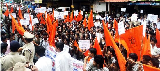 Putture, July 30: ABVP union students staged a protest supporting student Ranjith, who was accused in the Muslim girl’s hair pulling case at Uppinangadi College campus, here on Monday.