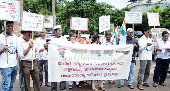 Mangalore, August 11: Opposing the exclusion of political parties from the Right to Information act, Aam Adhmi party members staged a protest in front of the deputy commissioner office on Saturday.