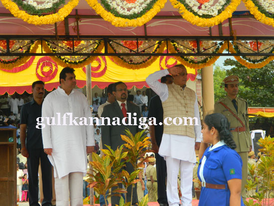 | Udipi; August 15: Vinaya Kumar Sorake, minister for urban development and district in charge hoisted the national flag in the district level ceremony organized in Ajjarakadu Mahatma Gandhi district stadium and received guard of honor. A March past comprising of 20 teams including the students from different school, colleges, Sevadal and police department staff and colorful cultural dances were the highlights of the occasion. |