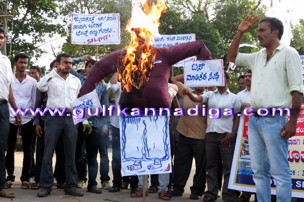 Mangalore, August 21: Opposing the private bus owners’ stand towards increasing the price of travel, without gaining the permission from district administration, SFI and DYFI staged a protest in front of Deputy Commissioner Office to control the increasing rate in the buses.
