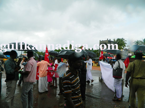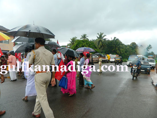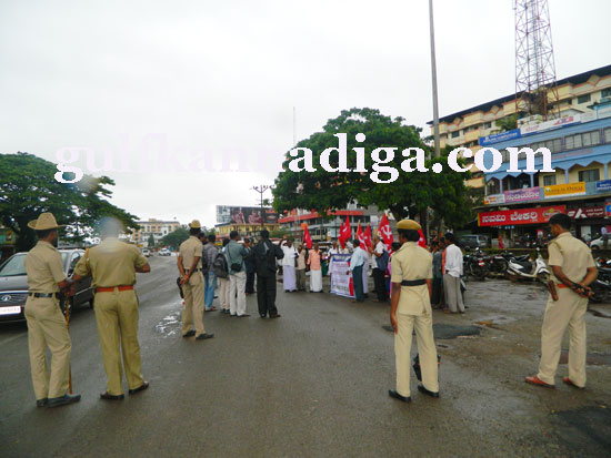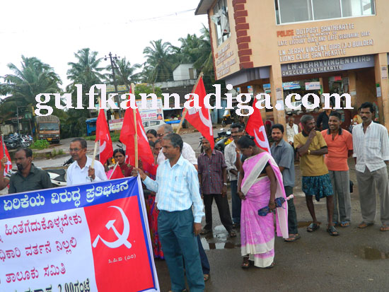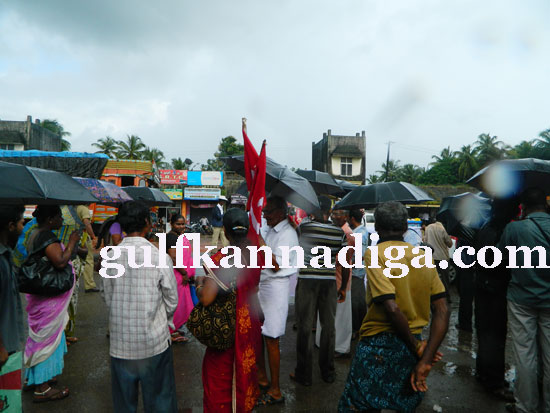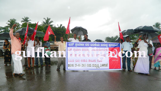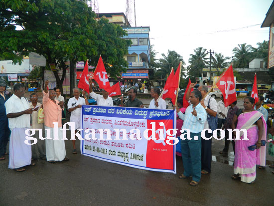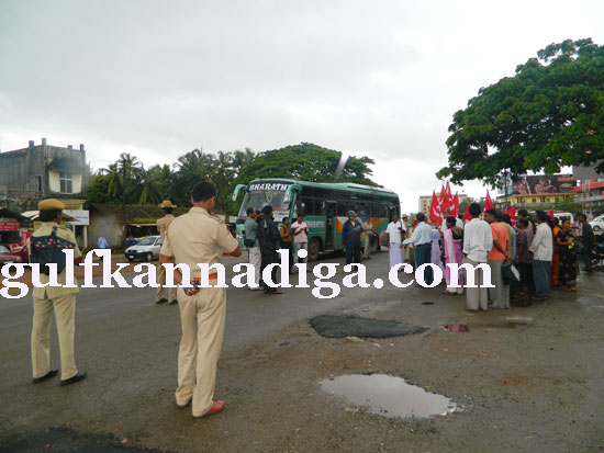 Udupi; August 23: Condemning the unjustified and undemocratic bus fare hike and dictatorial and arbitrary attitude of the bus owners association, CPIM on behalf of udupi taluk staged a protest by blocking the road (Rasta roko) on August 22, Thursday at Santhekatte national high way.
