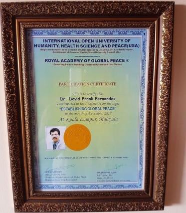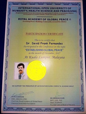 Received Participating Certificate for ‘Establishing Global Peace’ by International Open University of Humanity, Health Science & Peace (USA), at Kaula Lumpur Malaysia.
