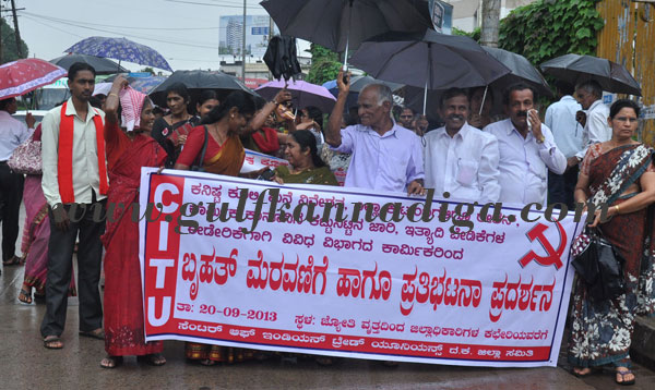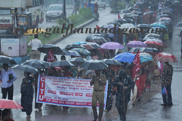In spite of the heavy rain, a protest begins from Ambedkar Circle, Jyothi to the DC office. They raise their voice to demanding for minimum wage, check on price hike of essential commodities, implementation of labour laws and signing an agreement which gives the right to labourers to form unions and have their rights at work place.