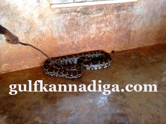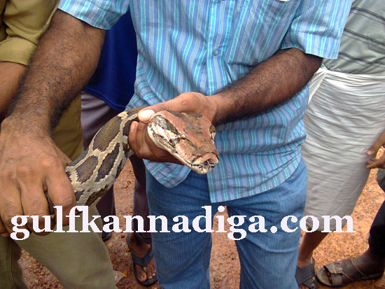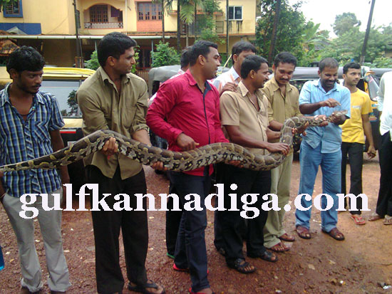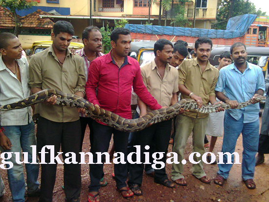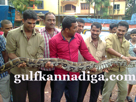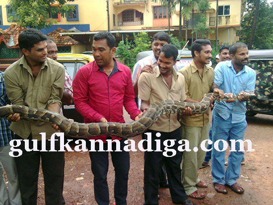 Udupi; Sept 20:  A giant, measuring around 12 feet long python has been captured by reptile expert Paul Salins along with local auto drivers, at under construction building near Mannapalla in Udupi.