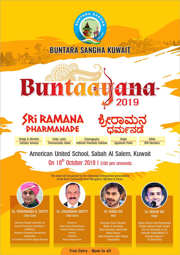 This year too we look forward towards every members support and announce Buntaayana with artists from Mangalore and guests from Mumbai and Oman. We would be introducing popular Actor & Bale Telipale fame comedian finalist Mr. Manju Rai Muloorand the new heart-throb young dynamic playback singer and Namma Super Singer finalist Mr. Nishan Rai to Kuwait audience.