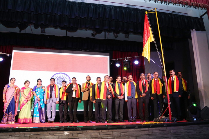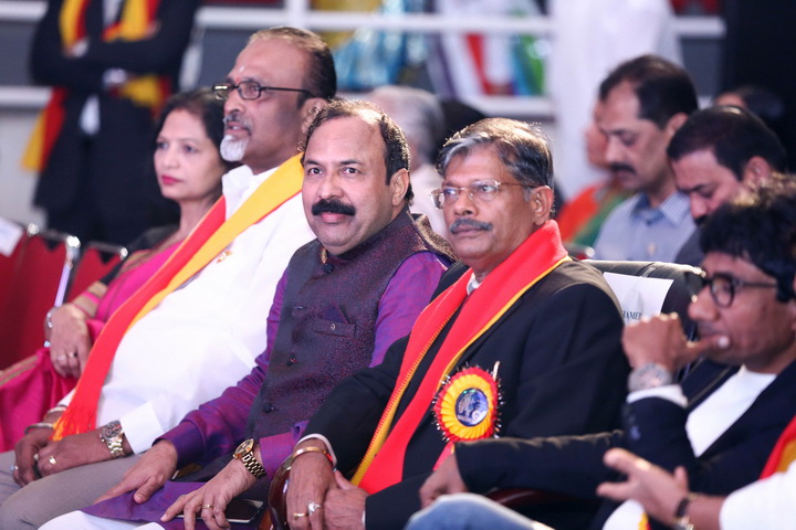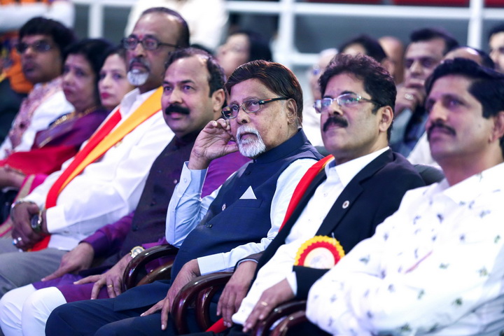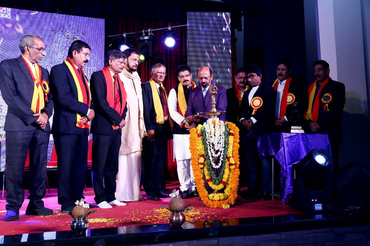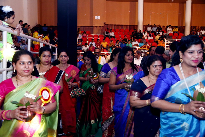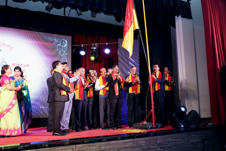 The formal stage programme started with lighting the traditional lamp by the main guests of the evening who were all welcomed over to the stage and honoured with flower bouquet and shawl of Karnataka Flag.