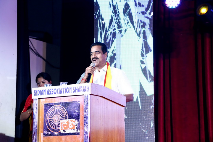 President of Sharjah Karnataka Sangha AnandBailoor did the welcome speech and later invited the Awardee for the honours. The award presentation were done in midst of all the Guests on stage viz., President of UAE Karnataka NRI Forum Praveen Kumar Shetty, Managing Director of Emsquare Engineering Mohammed Mustafa, President of Indian Association Sharjah, I.P. Johnson, Convener of Sharjah Karnataka Sangha Mark Denis, Ex-President of Sharjah Karnataka Sangha Ganesh Rai and General Secretary Noel Almeida. Later MLA of Karnataka State Umanath Kotian and MD of NammaKudla TV Channel Karkera arrived and were honoured on the stage.