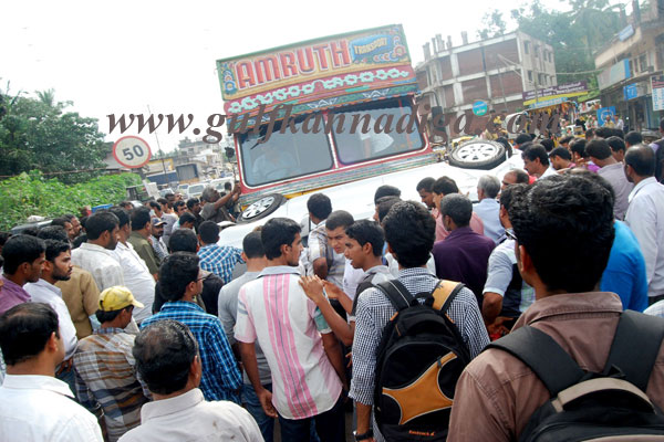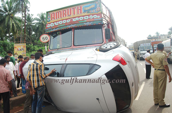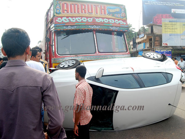 Bantwal, Sept 29: The lorry hit the car when the car driver lost control over the vehicle and overturned on road on Saturday at BC Road, and the women in the car injured hardly and the husband rescued with small injuries.