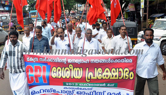 Kasargod, Oct 4: As the part of protest against the anti-people policy of central government organized by CPI all over India the members of CPI of Kasargod unit staged a protest in front of the post office here.