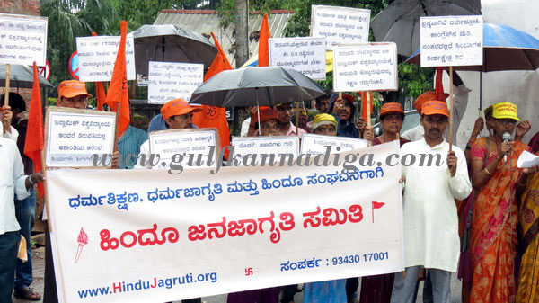 Mangalore, Oct 7: Opposing union government’s Heera International Islamic University near Tirupati Temple, activists of Hindu Janajagruti Samiti staged a protest in front of Deputy Commissioner’s office, Mangalore on Sunday Oct 6.