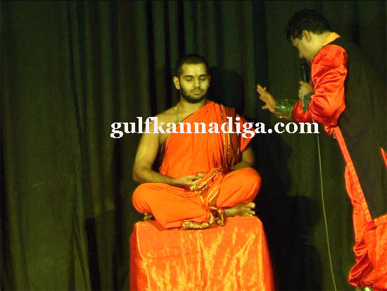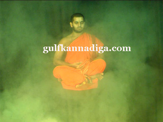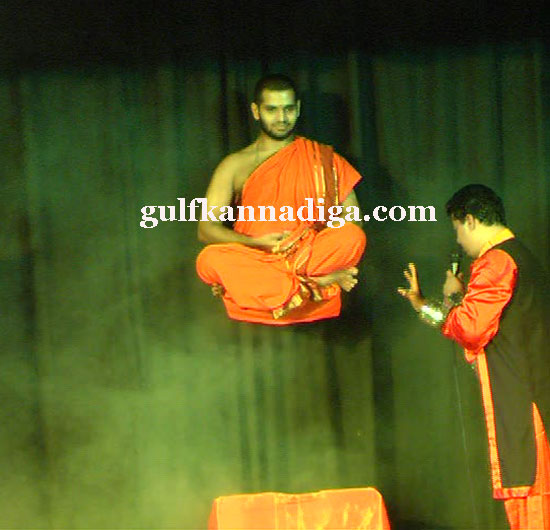 Udupi: Oct 14: Renowned magician Kudroli Ganesh using his levitation tricks made Udupi Mutt’s Sri Vishwa Vallabhateertha Swamiji to float in the air as people look on.
