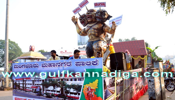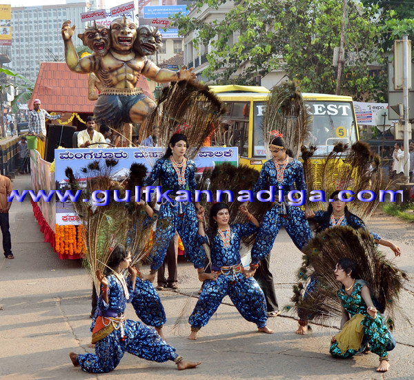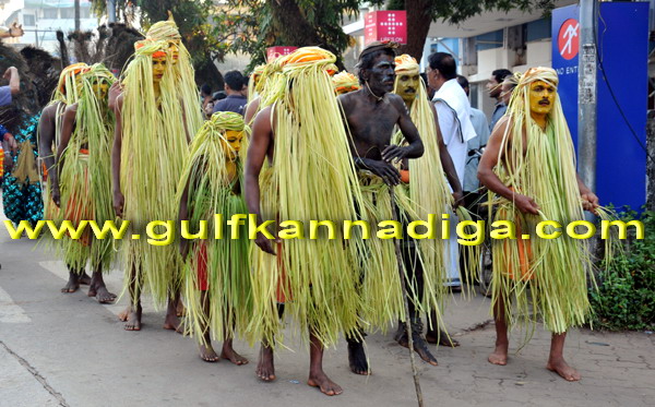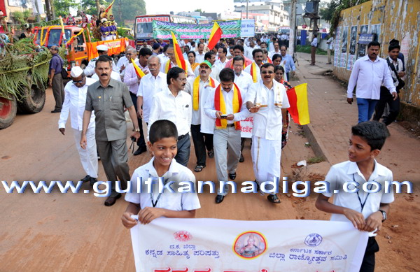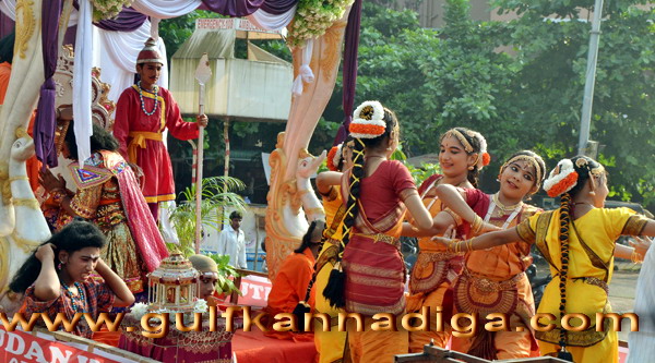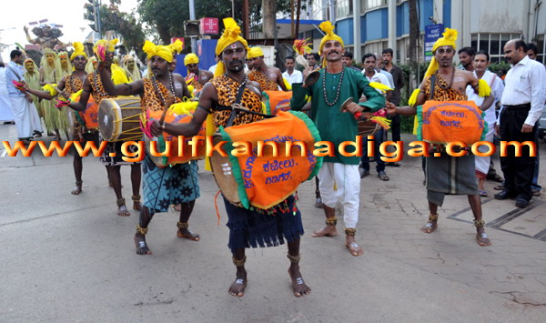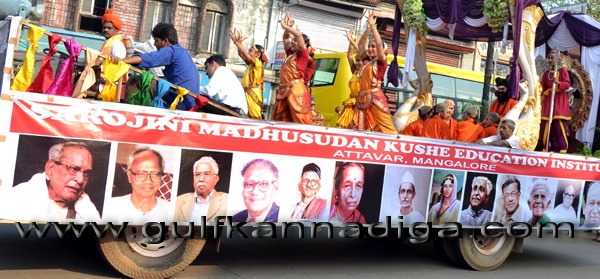 Students of various schools from Mangalore participated in the procession. Number of vibrant tableaux, statues, depicted richness of Kannada language and culture of the land. Including the president of Kalkura Pratistana Pradeep Kumar Kalkura and other nobles were take part in the procession.
