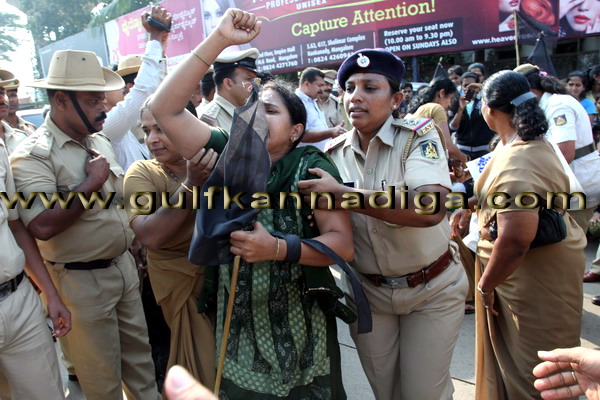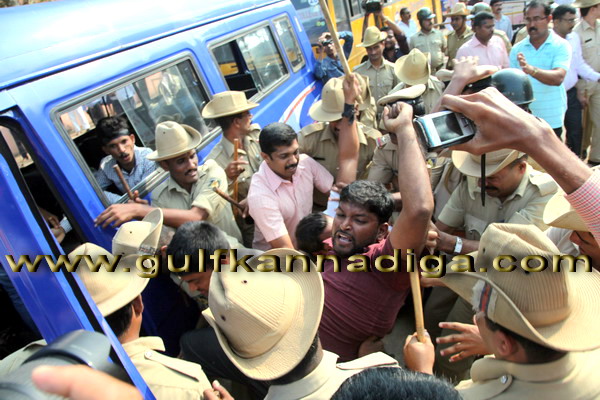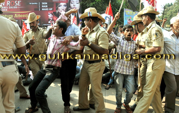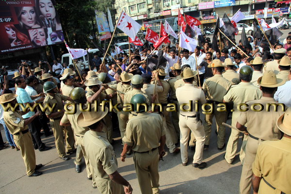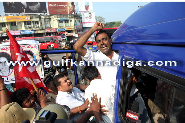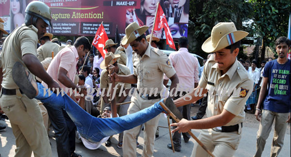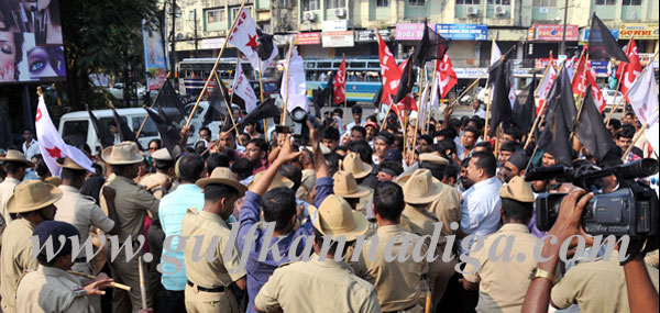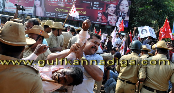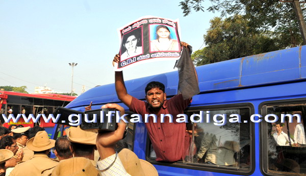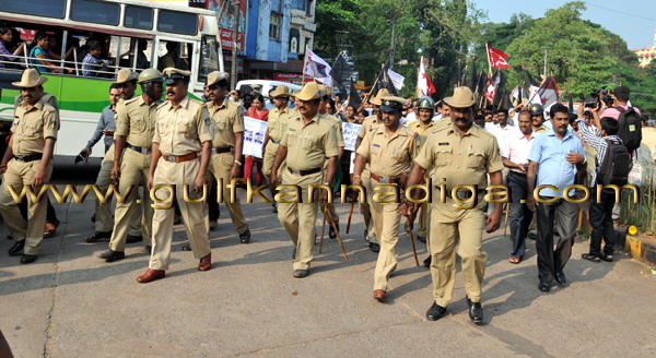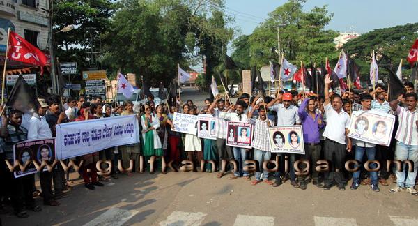 Demanding CBI probe into Sowjanya rape and murder case and to put pressure on minister Ramanath Rai in this regard, the members of Democratic Youth Federation of India (DYFI), Centre of Indian Trade Unions (CITU), Janavadi Mahils Sanghtane (JMS), Mahila Dourjanya Virodi Vedike (MDVV) and Prof. Krishnappa led Dalitha Sangarsha Samithi (DSS) marched in protest to Nehru Maidan waving black flags and tried to enter the venue. But the police stopped the protestors and took them away from Nehru Maidan.