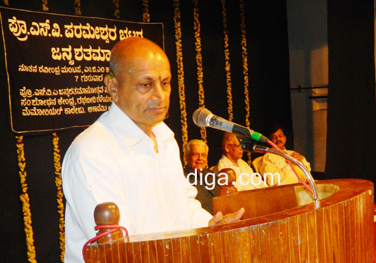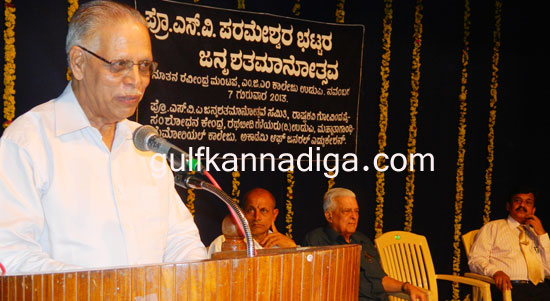 Udupi; Nov 07: While talking on “Prof.S.V.Parameshwara Bhattara Anuvadha Sahitya”(translated literature of Prof.S.V.Parameshwara Bhat) programme, held on Nov 07, Thursday in Ravindra Mantap,organized under the auspices of Mahatma Gandhi memorial college and academy of general education, Prof.S.V.P. Centenary celebration Samiti, Rashtra Kavi Govind Pai research centre, Rathabeedhi friends,Dr Padekallu Vishnu Bhat said in his address that Dr.S.V.Parameshwara Bhat enriched the field of literature through translation and his own creation.
