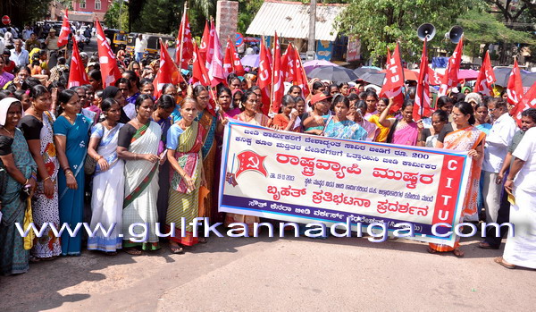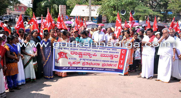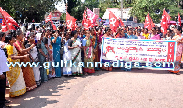 Mangalore, Nov 19: Demanding for a minimum wage of Rs 200 for every 1000 beedis rolled and various other demands, the Centre of Indian Trade Unions (CITU) organized a protest for the welfare of the Beedi workers, in front of the DC office on Tuesday November 19.