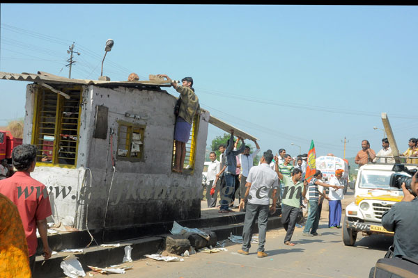 Bantwal, Dec 5: Political parties and local groups protest against the new tollgate that has started functioning at Brahmarakootlu on national highway 75. By the pressure of protestors toll collection stoped at Panemangalore on Thursday December 5 .