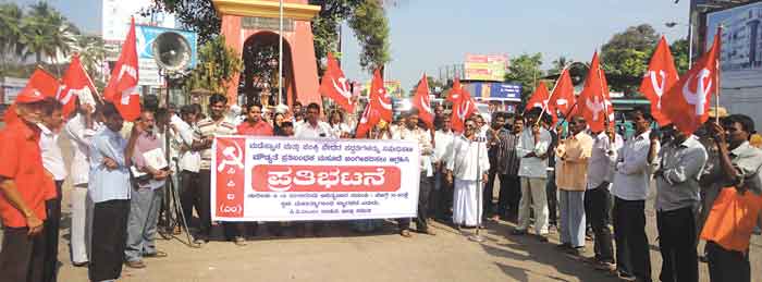 Udupi; Dec 09: Addressing the protestors in the protest rally organized by CPM Udupi district Samiti on Dec 08, Sunday near clock tower near Udupi bus stand, K.Shankar, Udupi district secretary said in his address that bad practices and blind faith celebrations are being celebrated in 65 places including Kukke Subramanya. This is another face of caste discrimination and has to be prohibited this type of misfortune celebrations.
