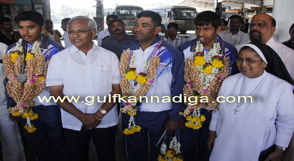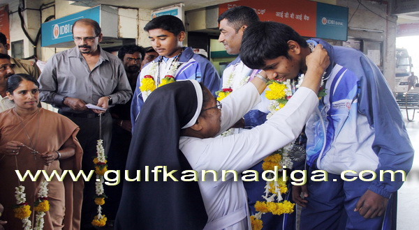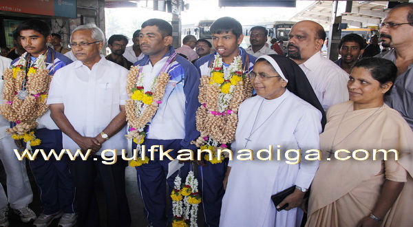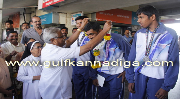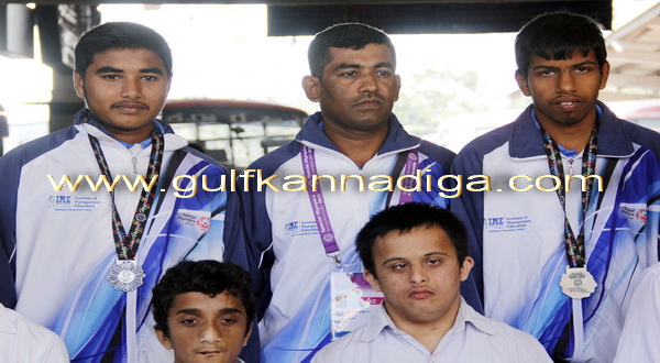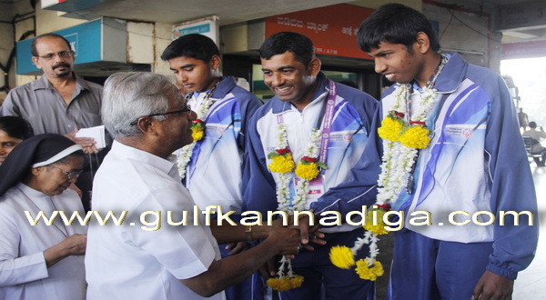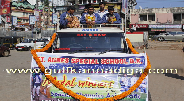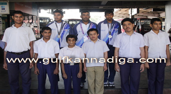 Mangalore, Dec. 18: The silver medal winners of St Agnes Special School, Bendur who participated in the Special Olympics Asia Pacific (SOAP) Regional Games, in the Cricket match held at Sydney, were given a stirring welcome at the KSRTC Bus stand here on December 18.