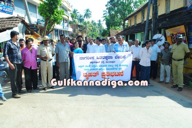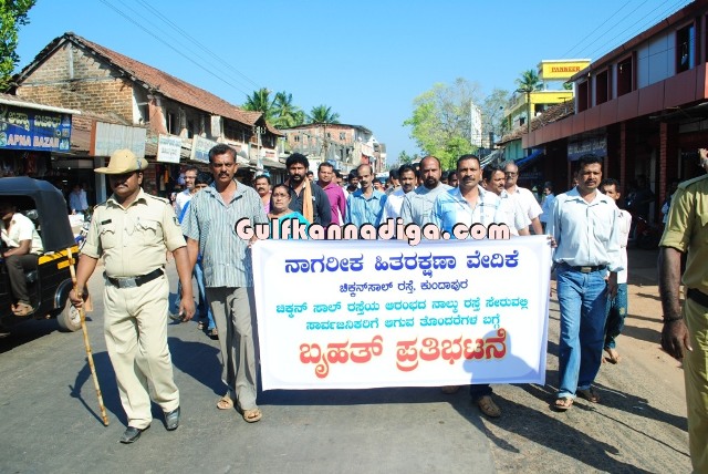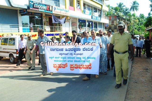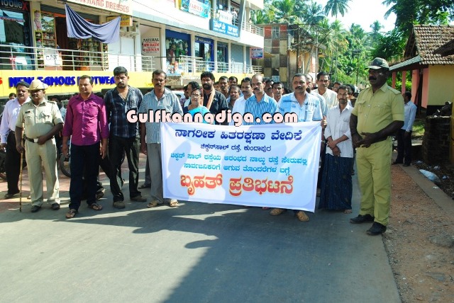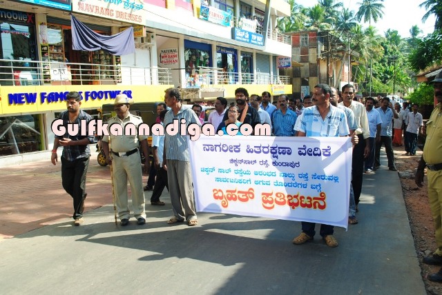 Kundapur; Dec 19: Condemning the lethargic attitude of municipality by allowing unauthorized construction of commercial buildings on encroached roads by the owners of the commercial complexes from Sangam area on NH 66 that connects Kumudapura municipality main road on Chikkan saal, which connects market place, members of Nagarika hitarakshana (public welfare vedhike) staged a protest in front of municipality.