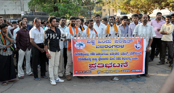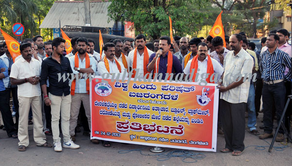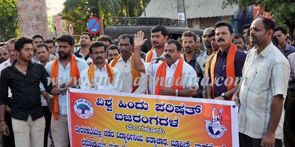 Mangalore, Dec 25: The members of VHP and Bajrang Dal organized a protest in front of DC Office on Tuesday, Dec 24 demanding CBI probe into the kidnap, rape, and blackmail of a student of Deralakatte Medical College student.