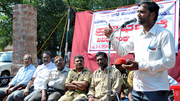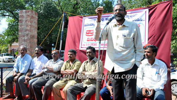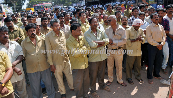 Mangalore, Jan 1, 2013: The members of DK district auto rickshaw drivers’ and owners’ union jointly with Mulky auto drivers’ and owners’ union and other associations organized a protest in front of the DC office on Jan 1, Wednesday demanding public apology by Minister Abhaychabndra Jain for the assault in Mulky.