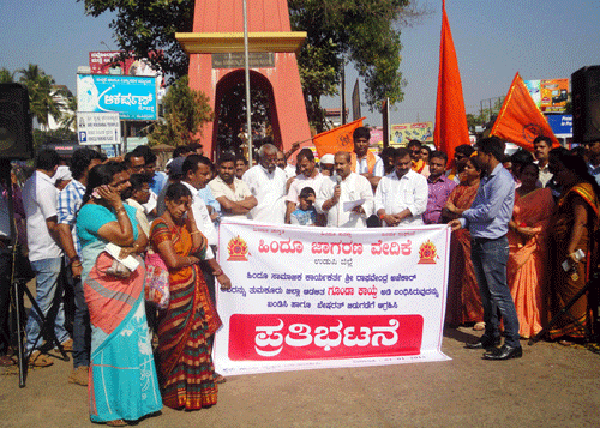 Udupi; Jan 02: A protest was organized by Hindu Jagarana Vedhike on Jan 01, Wednesday in Udupi Service bus stand near clock tower condemning the arrest of Raghavendra Ajekar, an active activist of RSS at Tumkur under Goonda act.In this regard a memorandum was forwarded to state home minister through district commissioner.