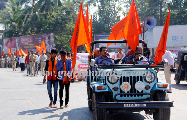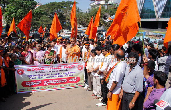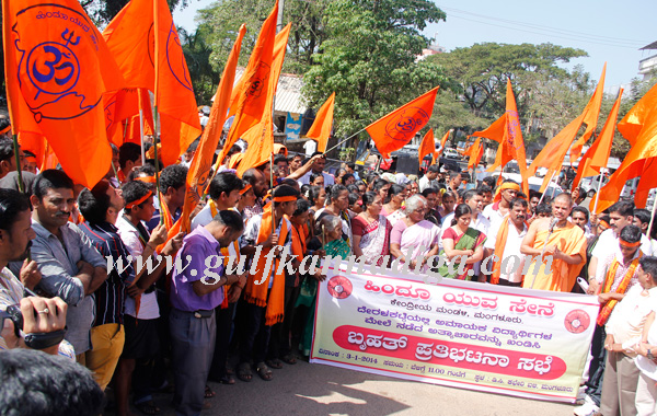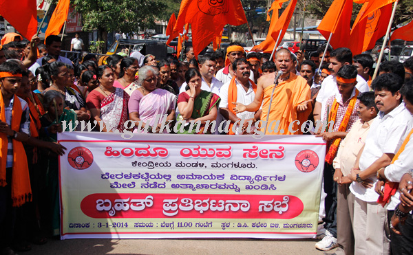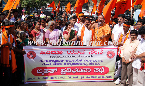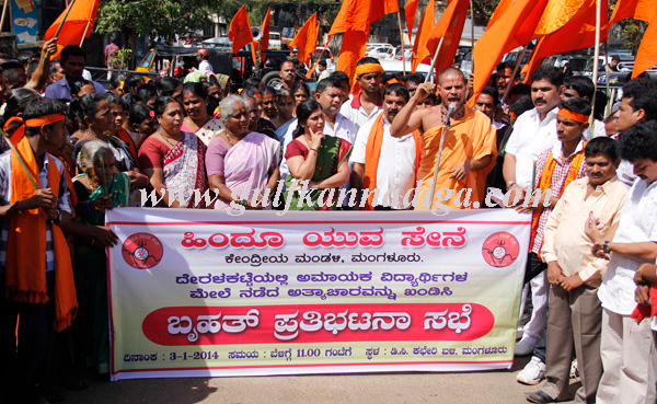 Mangalore, Jan 3: The members of Hindu Yuva Sena (HYS) staged a protest in front of the DC Office on Friday Jan 3, urging the state government to take strict action against the accused of kidnap, forced sex and blackmail of Deralakatte case.