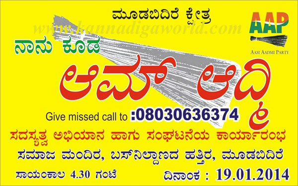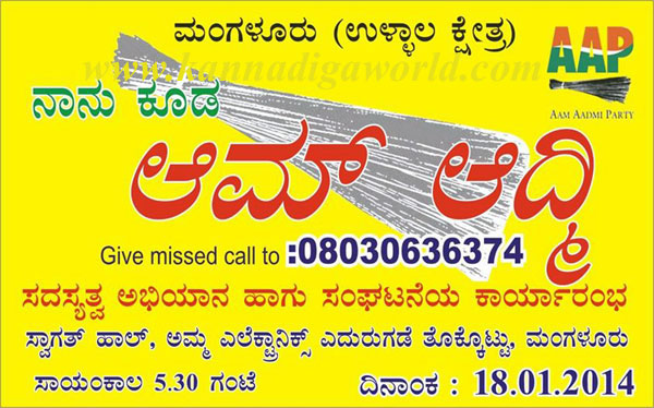 AAP Public Membership Drive will be conducted at Swagath Hall, Opp. Amma Electronics, Thokkottu (Mangalore Constituency) on Saturday (January 18) at 5.30 pm.
