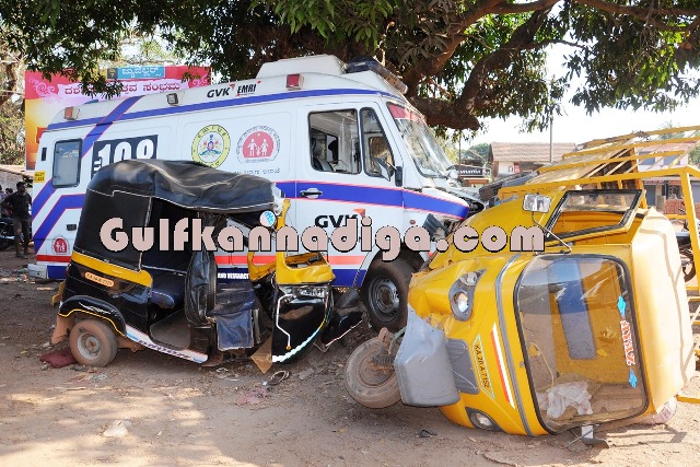 According to the sources, the ambulance (108) which was going towards Bhatkal from Kundapur on NH 66, in order to avoid possible accidents against the vehicle coming from the opposite direction, lost the control of his vehicle and rammed into bike and then rickshaws, which was standing nearby (Passenger, Luggage) resulting the death of bike rider Kadke Chandra Gonda(26) on the spot and other rider Kadka Nagaraja and Mahammad Gouse,who was sitting inside the auto rickshaw were seriously injured.