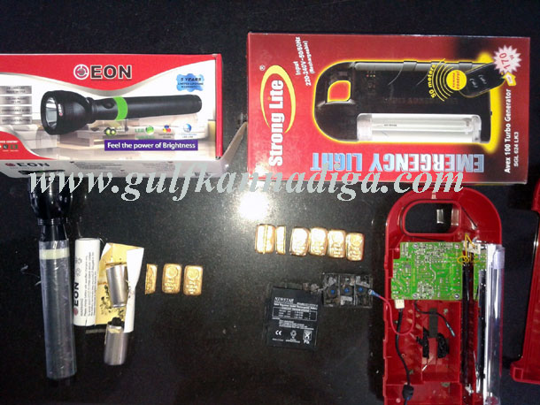 Mangalore : The officers of Customs at Mangalore International Airport seized gold totally weighing 1399.650 grams in three separate cases totally valued at Rs.43,38,915/- In the first case, the officers seized 10 (Ten) gold pieces, totally weighing 933.140 grams and valued at Rs.28,92,734/- concealed in an emergency light and a rechargeable LED flash light from the possession of a passenger named Ms. Mehazabin Rumana who is a resident of 8-166, 8th Block, Chokkabettu, Katipalla, Surathkal, Mangalore, Dakshina Kannada-575014 and arrived at Mangalore International Airport on 22.02.2014 at about 05.30 hrs by Jet Airways fight 9W531 from Dubai. The said passenger was arrested later and produced before Shri.N.S.Patil, Principal Civil Judge Senior Division and Chief Judicial Magistrate, Mangalore, who remanded the accused to Judicial custody till 10.30 AM of 24.02.2014.
