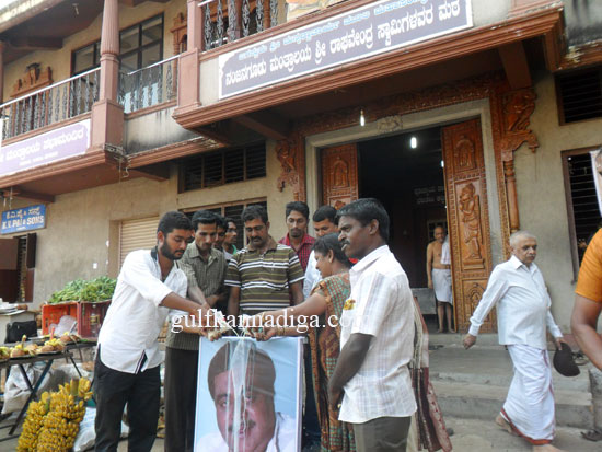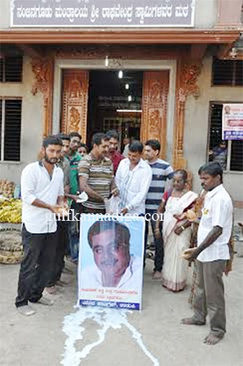 A Pooja was performed by youth congress members in Raghavendra Monastery’s Raghavendra Swamy, favorite God of Ambareesh, in Udupi Sree Krishna’s car street for the speedy recovery and discharge from the hospital soon of state housing minister and actor Ambareesh by pouring milk on the portrait and prayed.