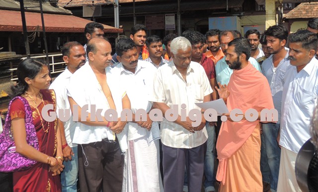 Allow household waste water into the river after purifying. Arrangement for the underground drainage system to be made in the place. Provide basic infrastructure facilities for the pilgrims coming from different parts of the country. All Tirthas should be cleansed and make sacred. Money collected from the devotees, should be utilized for the development of the place and other demands. The memorandum containing all the above demands was submitted to L.S.Maruti,CEO of the temple by Swamiji.Krishnamurthy,assistant executive, Ramakrishna Adiga,superitendent were present on the occasion.