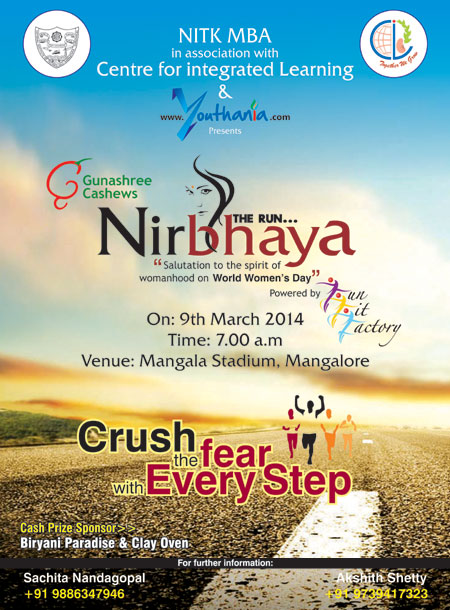 Mangalore : In view of expressing concern and creating awareness on Women’s security issues the students of Department of MBA at National Institute of Technology Karnataka (NITK) in association with Centre for Integrated Learning(CIL), a city based NGO and youth portal www.youthania.com will be organising `Gunashree Nirbhaya Run’ in the city on March 9. The run traversing through the city will also mark the Women’s Day observance (March 8) and reassure that youth are going to lead the way to initiate action in redressing the burning issue that is making news throughout the country.