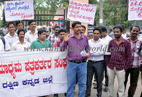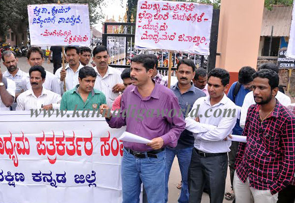 Mangalore, Mar 13: The members of Electronic media journalists association staged a protest in front of DC office on Wednesday, March 12, condemning the false complaint filed by energy minister D.K.Shivakumar against TV 9 journalists Shreyas and Shwetha Prabhu.